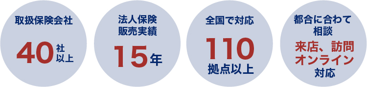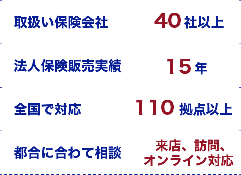 ほけん の110番は全国に110拠点以上のほけんショップを展開し、40社以上の取扱保険会社の最新の商品の中から、お客様一人一人に合ったプランをご提案しております。個人法人のご相談はもちろん法人向けの保障(補償)も専門の担当者がご相談を承ります。保険についてお困りごとがあればなんでもご相談いただけます。