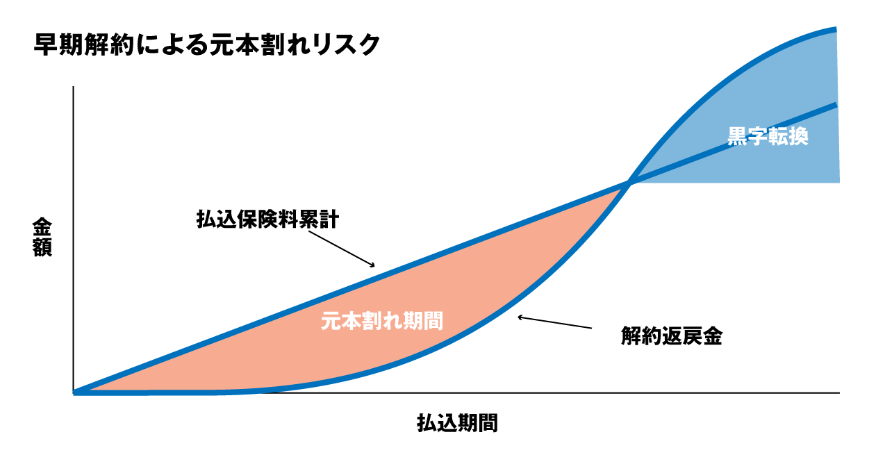 多くの場合、加入してから10年〜15年といった長期間が経過するまで、解約時に戻ってくるお金(解約返戻金)が、それまでに支払った保険料の総額を下回る「元本割れ」の状態が続きます。