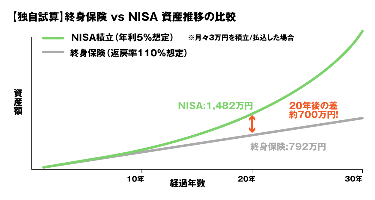 月々3万円を20年間積み立てた場合、NISAは終身保険の2倍以上の資産額になる可能性があります。