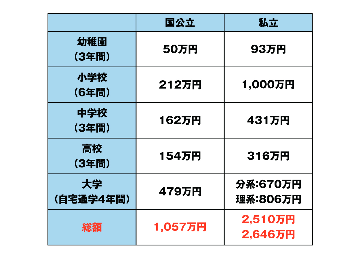 ▼幼稚園から大学までの教育資金(自宅通学の場合)